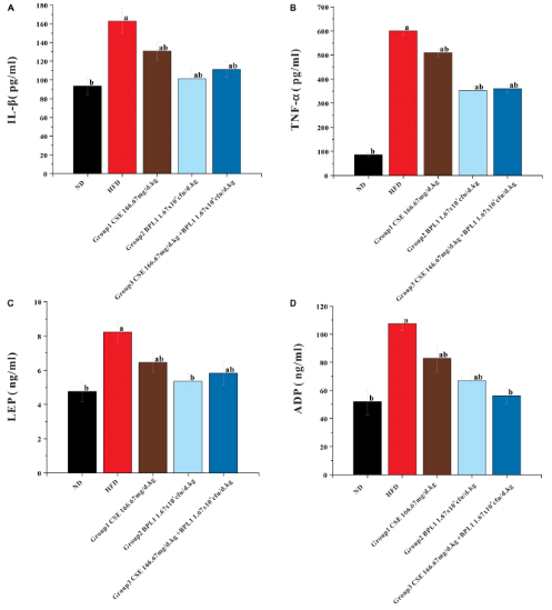 (A) 炎症因子白细胞介素-1β(IL-1β);(B) 炎症因子肿瘤坏死因子-α(TNF-α);(C) 血清瘦素(LEP)水平;(D) 血清脂联素(ADP)水平。数据以均值 ± 标准差表示(n=12);a:与正常对照组(ND)相比,P<0.05;b:与高脂模型组(HFD)相比,P<0.05。