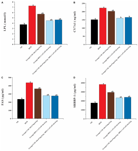 (A) 脂蛋白脂酶(LPL);(B) 脂肪酸合成酶(FAS);(C) 胆固醇7α-羟化酶(CYP7A1);(D) 固醇调节元件结合转录因子 1(SREBP-1)。数据以均值 ± 标准差表示(n=12)。a:与正常对照组(ND)相比,P<0.05;b:与高脂模型组(HFD)相比,P<0.05。