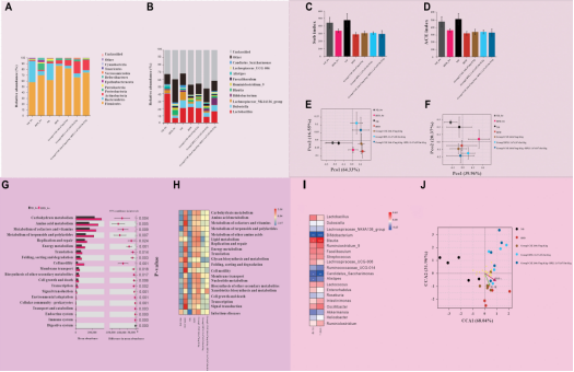 肠道菌群调节是薏苡仁发挥代谢调理作用的另一重要路径。肠道菌群平衡与代谢健康密切相关,肥胖小鼠的肠道菌群结构存在明显异常,厚壁菌门、变形菌门占比升高,拟杆菌门占比降低,乳球菌属等有害菌丰度增加。如下图7,研究发现,薏苡仁提取物虽未直接改变抗炎相关菌群的丰度,但与益生菌联合使用时,能协同调节肠道菌群结构,显著增加双歧杆菌等有益菌丰度,减少与肥胖相关的乳球菌属,改善肠道菌群多样性和功能,进而增强糖脂代谢调节效果。此外,薏苡仁还能保护肠道黏膜免疫功能,修复肠道屏障,促进降糖信号通路传导,为代谢健康提供肠道层面的保障。